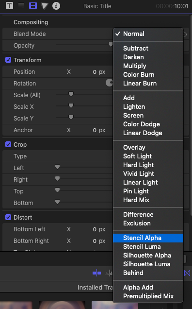 2. 자막 선택 후, Blend Mode를 Normal에서 Stencil Alpha로 변경한다.