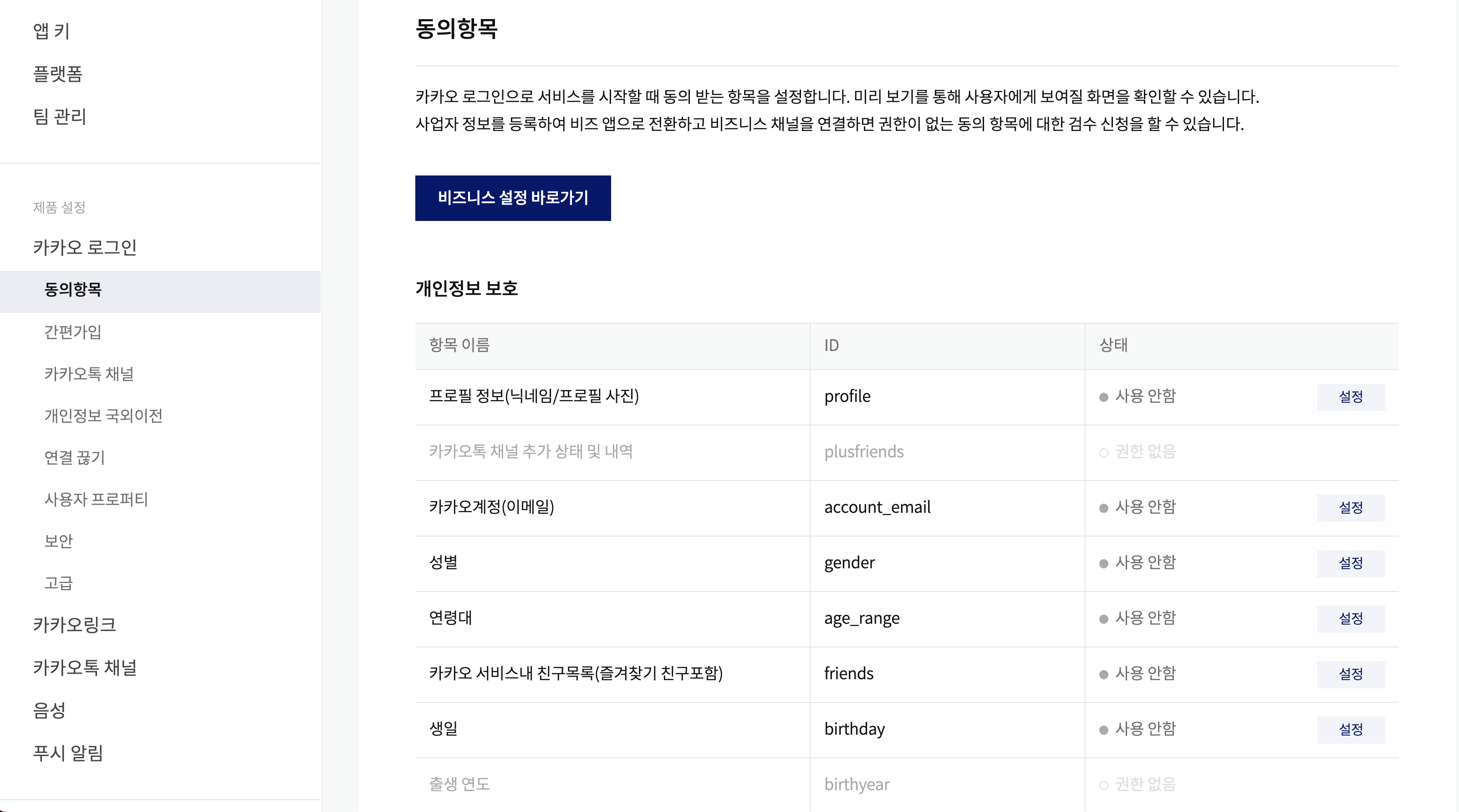 7. 동의항목을 설정해줘야, 유저로부터 동의를 얻어 정보를 가져올 수 있다.