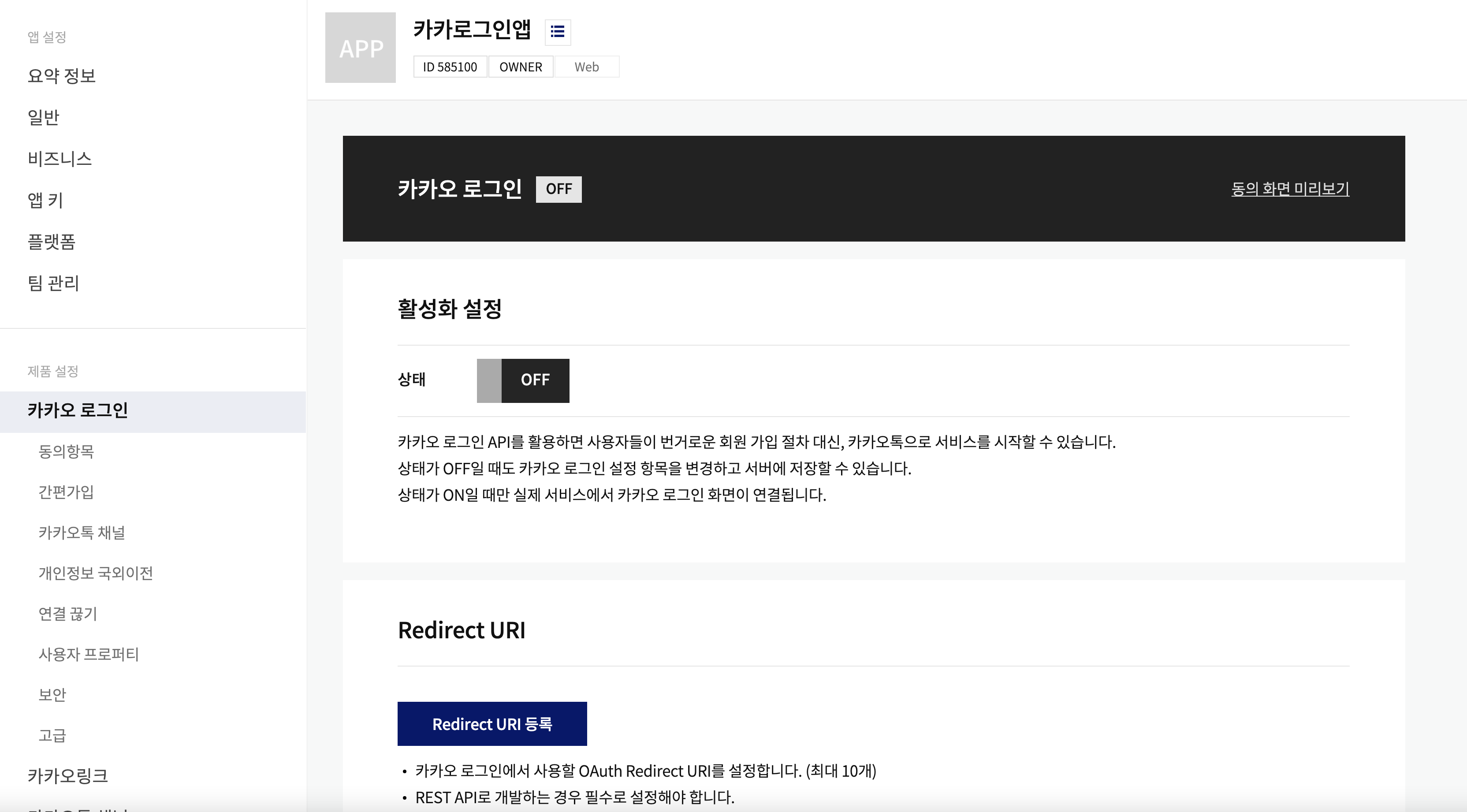 5. 하단에 Redirect URI 등록 버튼을 눌러 등록한다. 그리고 원하는 URI를 적어준 뒤 저장한다.