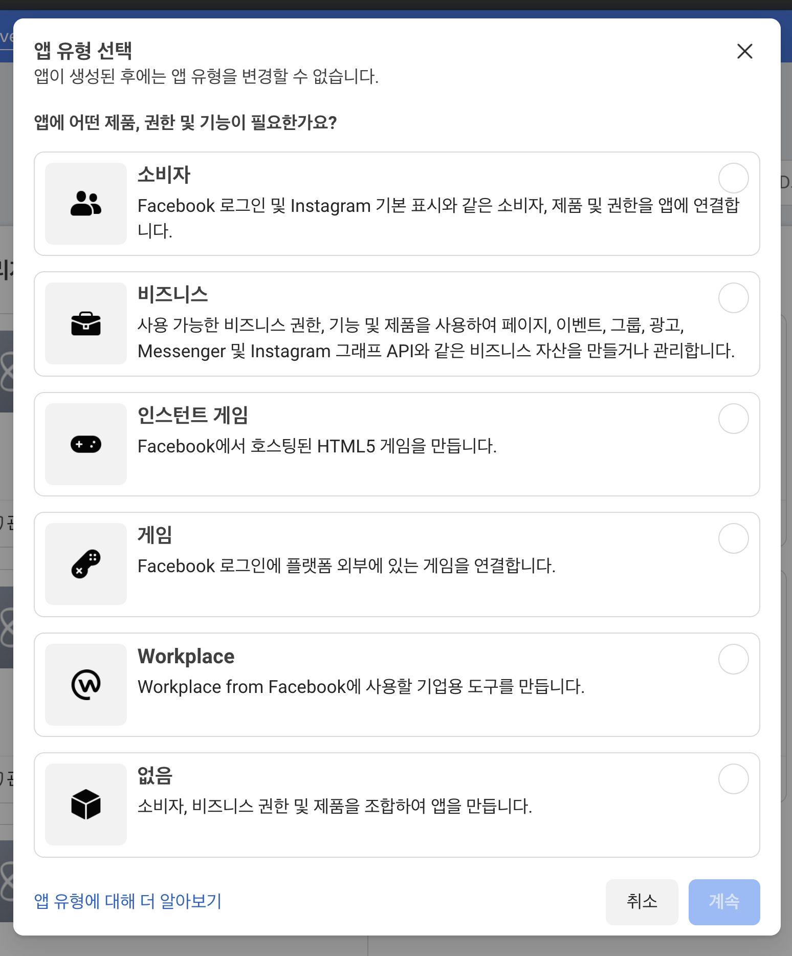 비즈니스 관리자 계정은 선택사항이므로 반드시 할 필요는 없다. 패스 후 , 앱 만들기 누르면 앱이 생성된다.