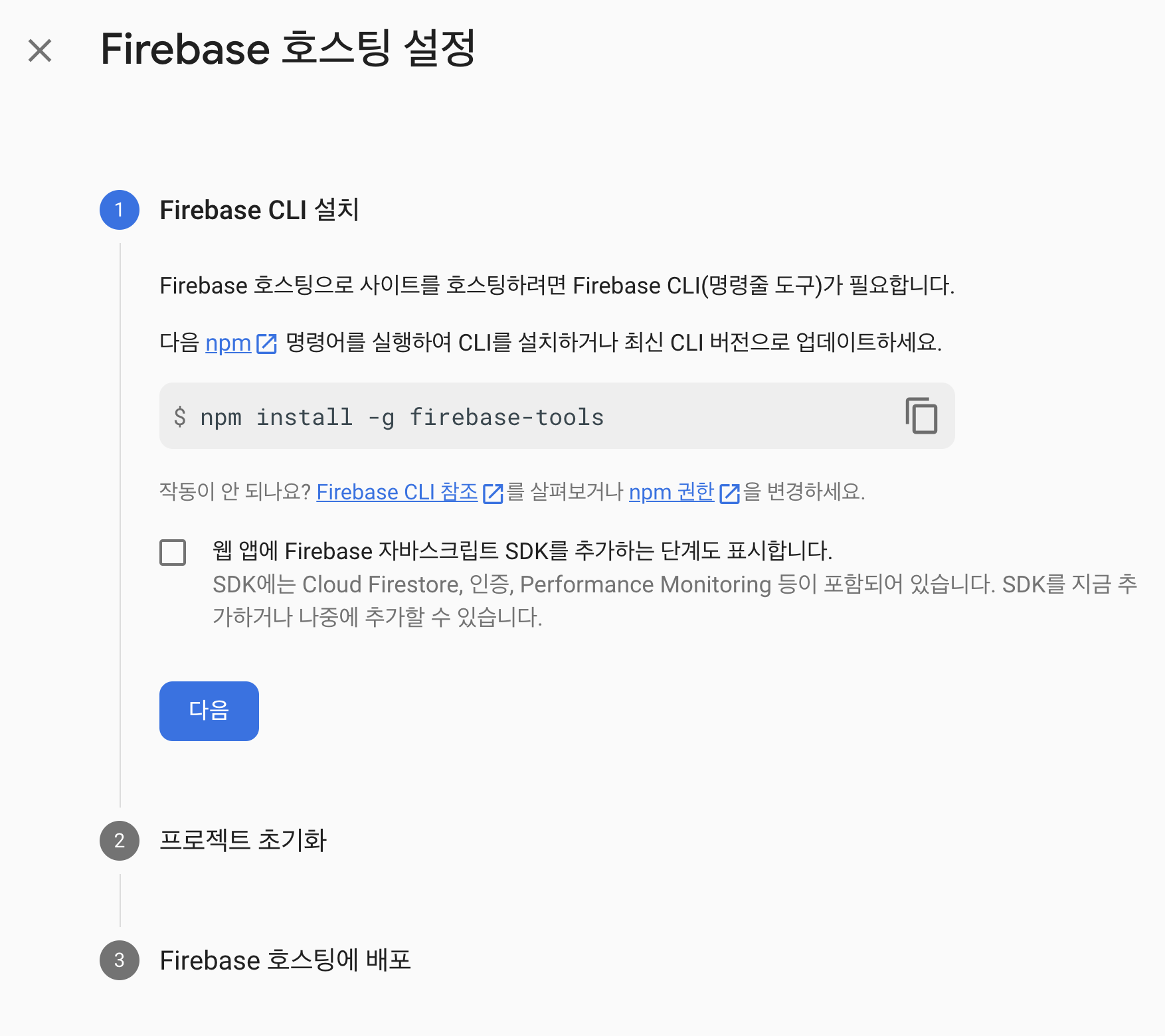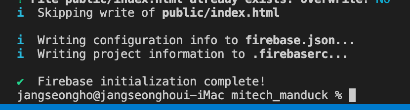 이렇게하면, 호스팅을 하고자하는 프로젝트에 파이어베이스를 초기화하여 설치하는 명령어이다.