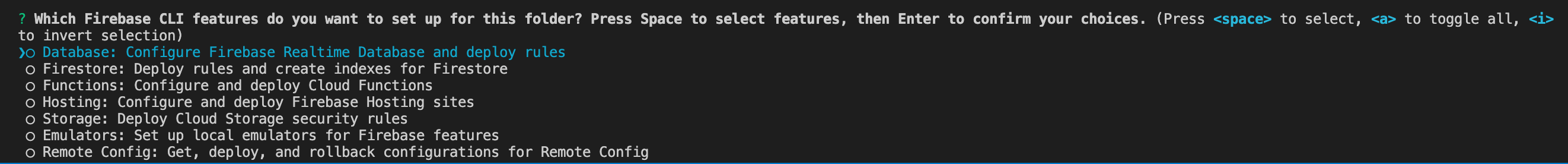 ? Which Firebase CLI features do you want to set up for this folder? Press Space to select features, then Enter to confirm your choices. (Press <space> to select, <a> to toggle all, <i>