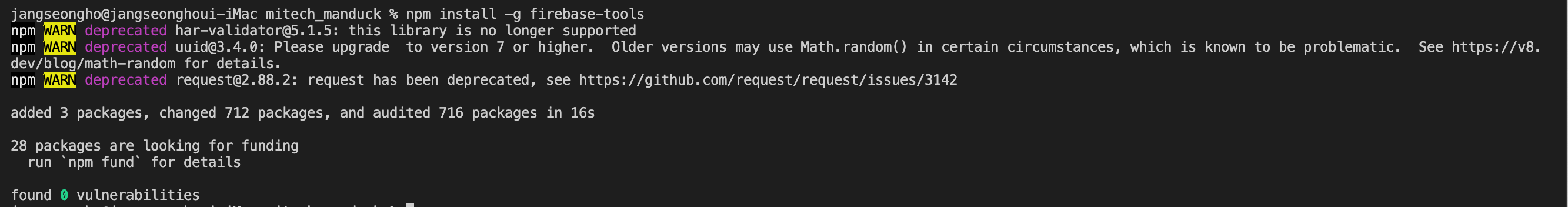 터미널에 입력하여 파이어베이스를 사용하기 위해 설치를 해준다.