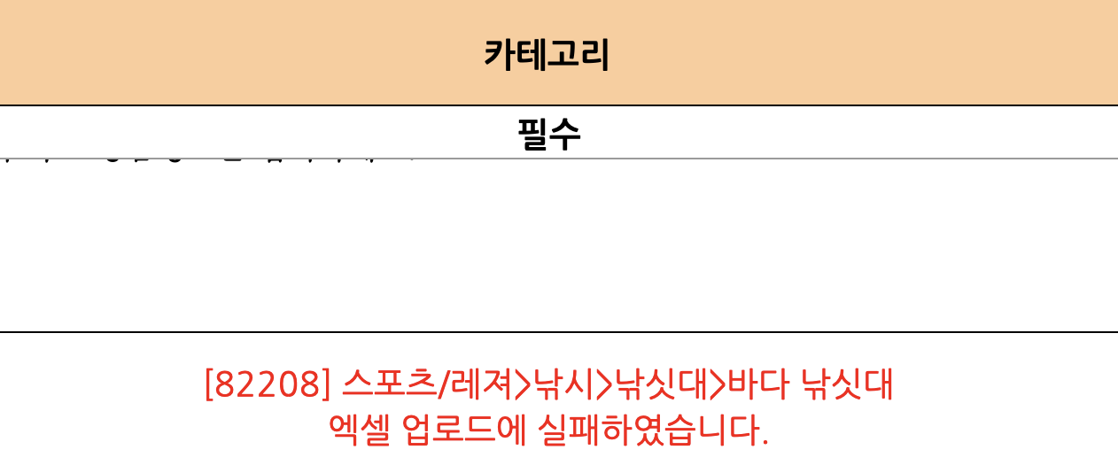 그런데, 아무런 원인 없이 그냥 카테고리에 이렇게 "엑셀 업로드에 실패하였습니다"라는 문구가 뜨면서 업로드에 실패하는 문제가 있었다.