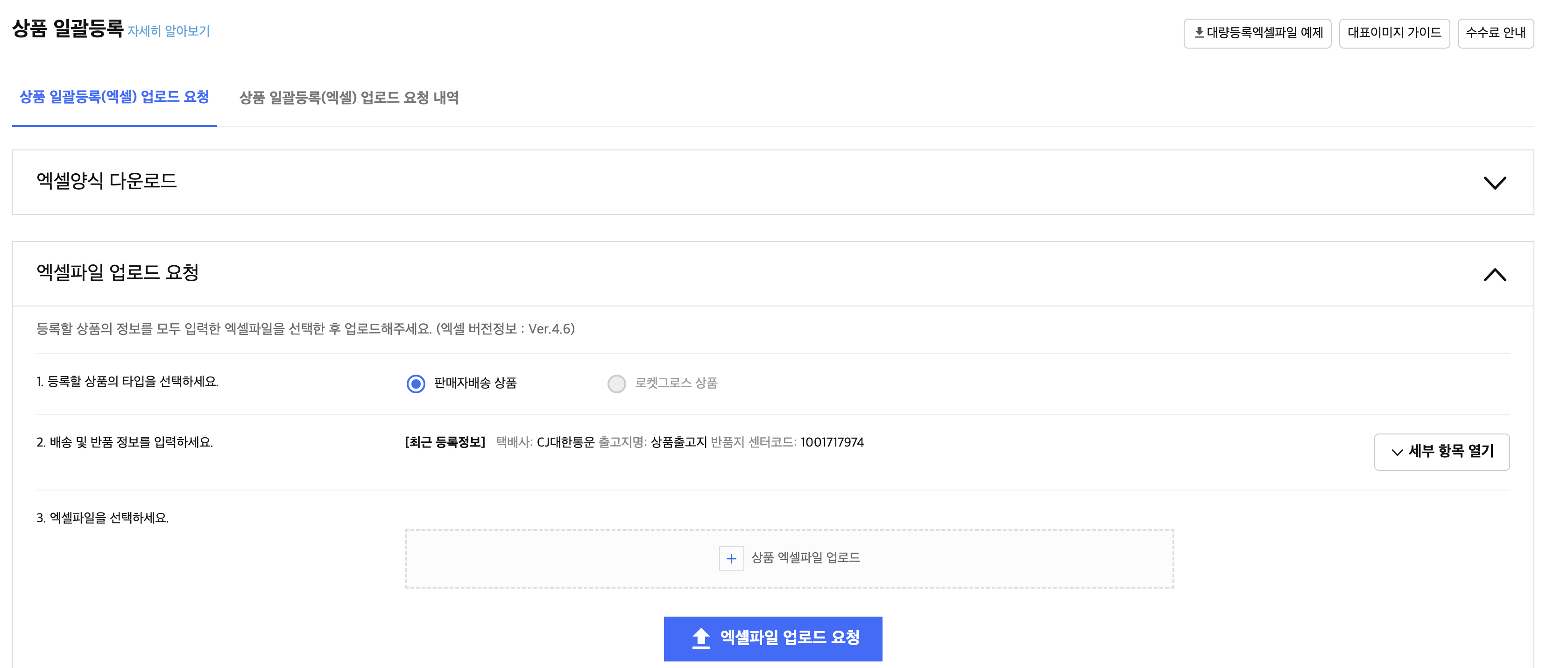 위에 대량등록엑셀파일 예제를 그냥 다운로드하여서 하는 것보다 카테고리를 먼저 선택 후 엑셀을 다운로드하는 게 더 좋다.