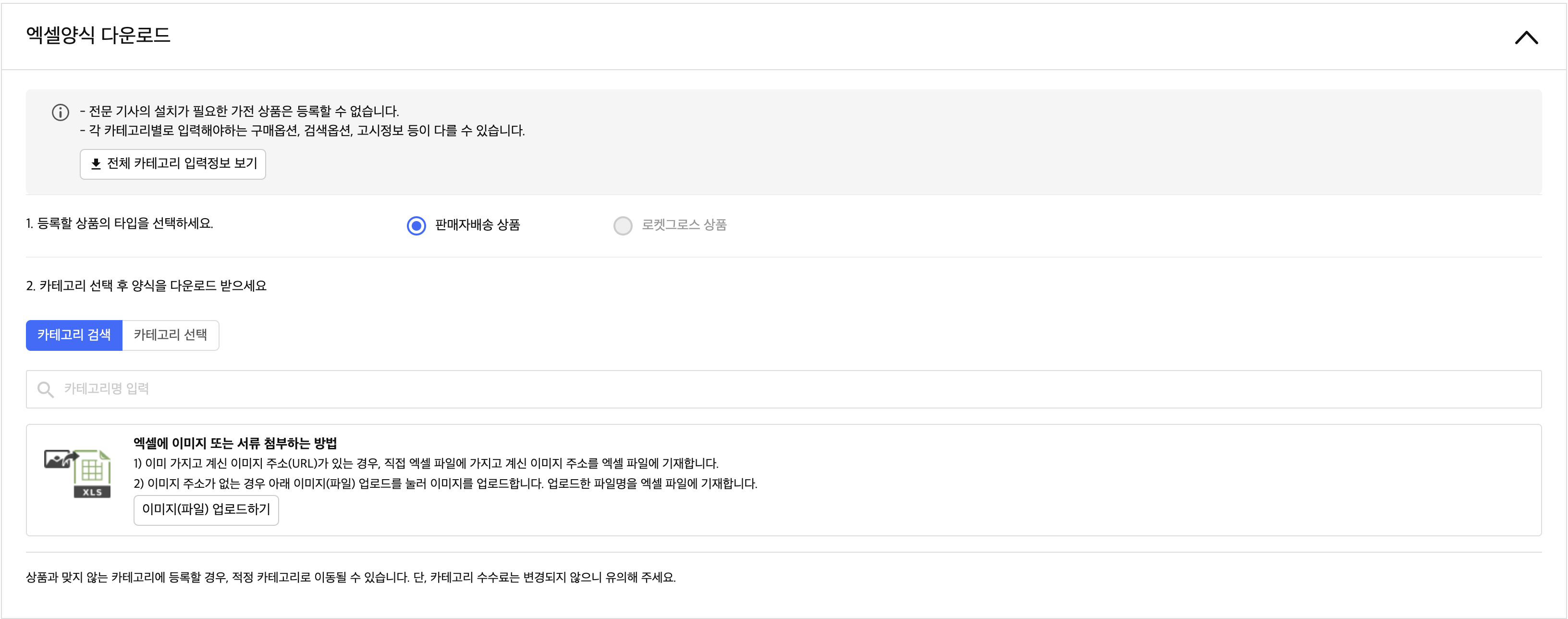카테고리를 뭐라고 쓸지 모르겠다면, 아래 화면에서 카테고리를 검색 또는 선택 후 엑셀을 다운로드할 수 있다.