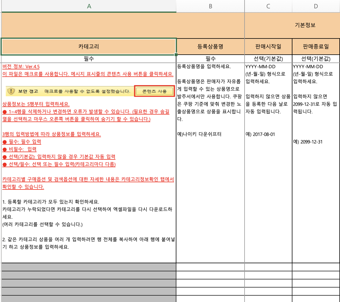 이렇게 카테고리를 설정 후, 엑셀을 다운로드하게 되면 엑셀에 기본적으로 어떤 부분을 필수값으로 작성해야 할지 표시를 해준다.