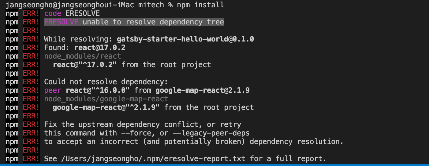npm ERR! See /Users/jangseongho/.npm/eresolve-report.txt for a full report.