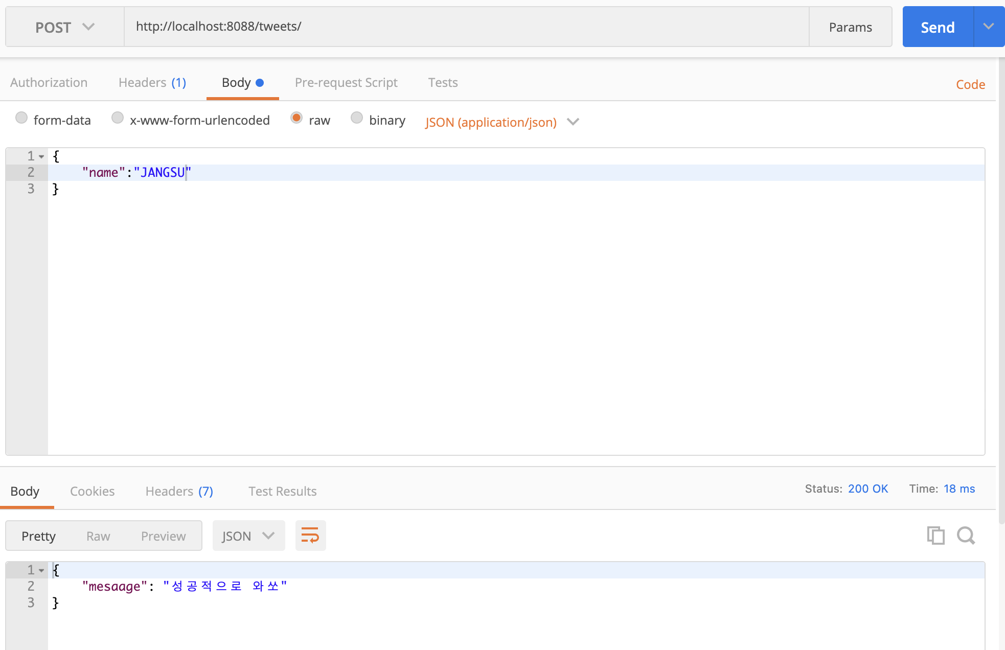 { "name":"JANGSU" }를 보내고, 응답을 받았다.