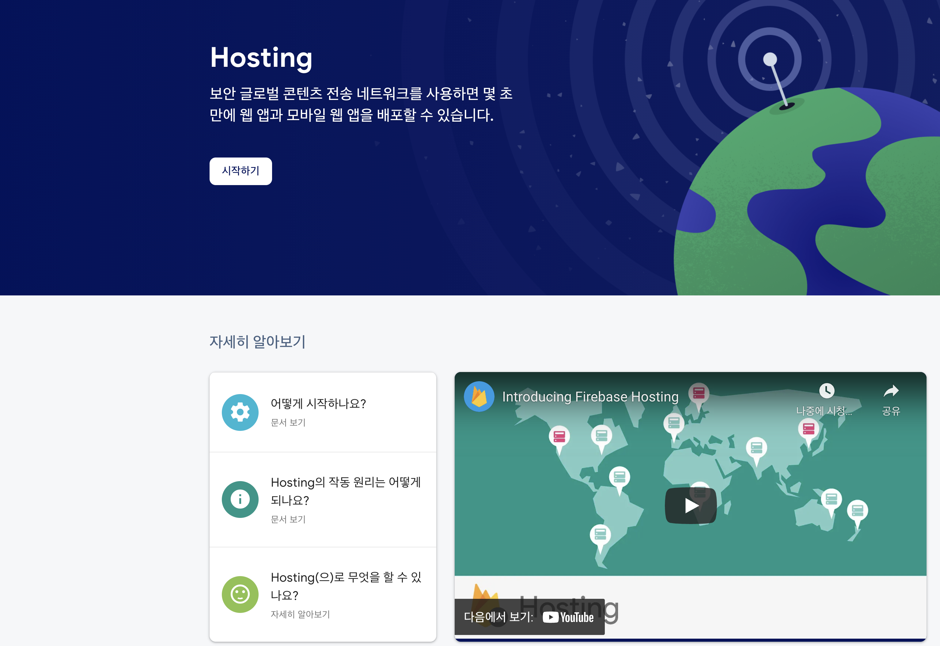 3. 호스팅이 아직 생성되지 않았다면, 다음과 같이 설명 등 첫 화면이 나온다. 상단에 시작하기 버튼을 누른다.