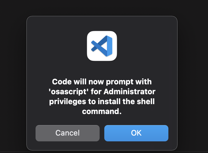 이렇게 install을 해주면 터미널에서 code .을 사용할 수 있게 된다.
